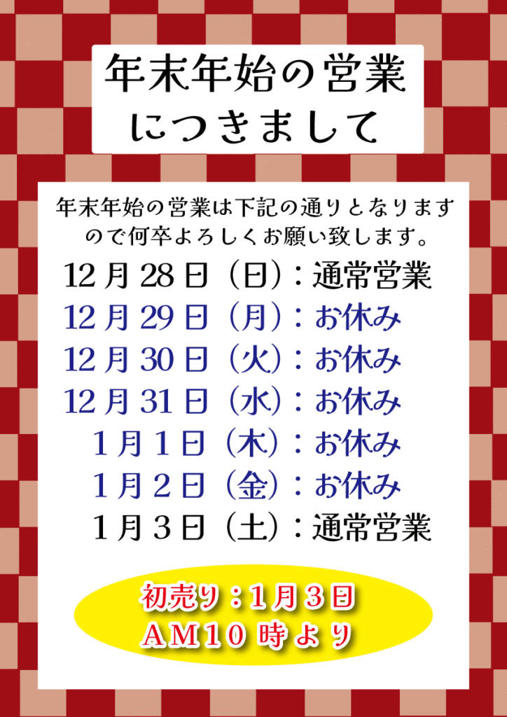 誠に勝手ながら下記の期間につきましてはお休みさていただきます。何卒よろしくお願い申し上げます。